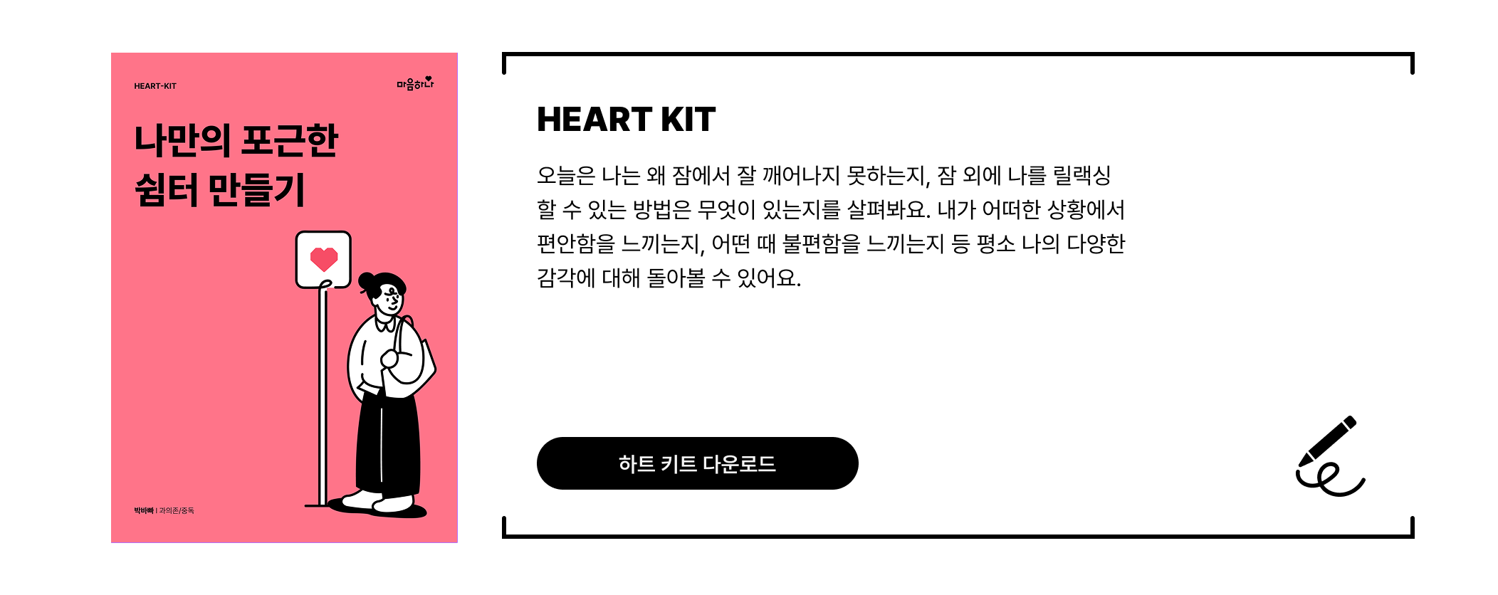 오늘은 <수면 과의존에서 벗어나는 첫걸음>에 대해 함께 이야기 나누었어요. 위에 적힌 방법 중 단 한 가지라도 스스로 선택해서 시도해 봤다면, 그건 분명히 나를 돌보는 소중한 첫걸음이 되어줄 거예요. 나아가 잠이 도피의 수단이 아니라 회복의 시간이 되어 하루하루가 지금보다 가볍고, 안정적으로 느껴질 거예요. 변화를 서두르다 보면 오히려 조급해질 수 있으니, 지금은 천천히, 나의 속도를 믿어봐도 좋습니다. |