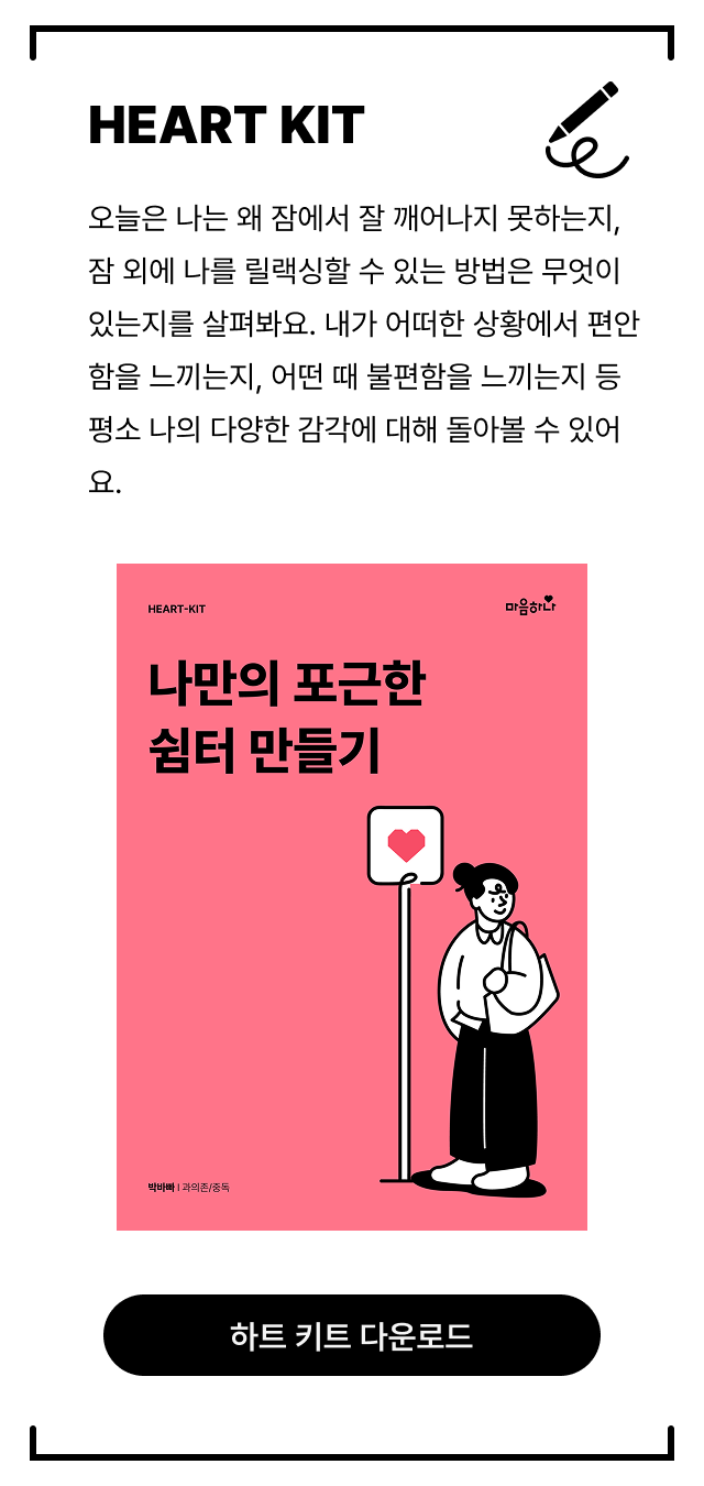 만약 이러한 불편함이 반복된다면, ‘지금 나에게 변화가 필요하다’라는 마음의 신호일 수 있고요. 지금부터, 지난 일주일간의 잠을 떠올려볼까요? 요즘 ‘잠’이 나에게 정말 도움이 되는지, 아니면 오히려 나를 더 지치게 하는지, 차분히 돌아보아요.