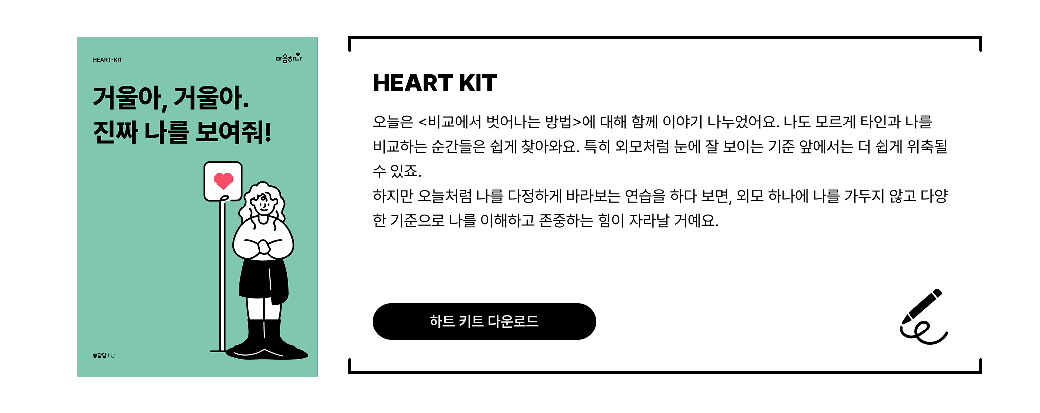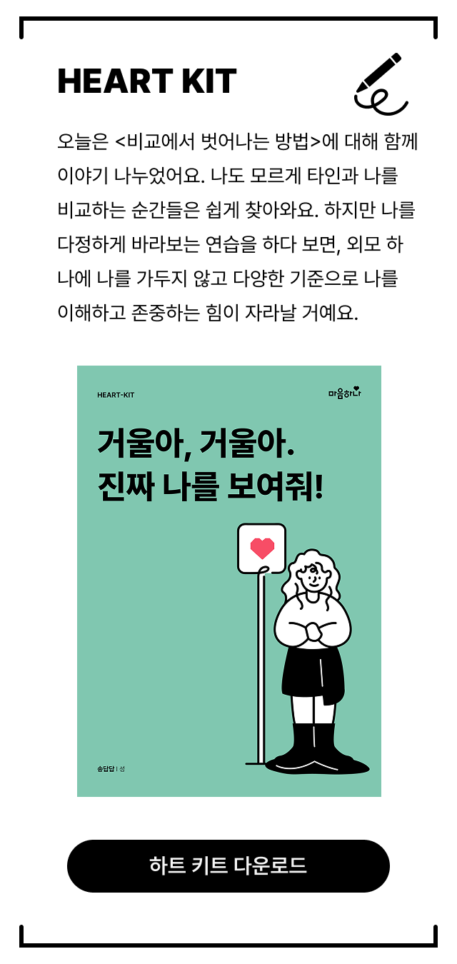 오늘은 <비교에서 벗어나는 방법>에 대해 함께 이야기 나누었어요. 나도 모르게 타인과 나를 비교하는 순간들은 쉽게 찾아와요. 특히 외모처럼 눈에 잘 보이는 기준 앞에서는 더 쉽게 위축될 수 있죠. 하지만 오늘처럼 나를 다정하게 바라보는 연습을 하다 보면, 외모 하나에 나를 가두지 않고 다양한 기준으로 나를 이해하고 존중하는 힘이 자라날 거예요. 오늘 나눈 이야기를 더 잘 정리하고 실천할 수 있도록 ‘하트키트(HEART-KIT)’를 준비했어요. 천천히 그리고 꾸준히 따라 하면서, 지금보다 나 자신을 더 다정하게 바라볼 수 있는 날이 오기를 바랄게요!