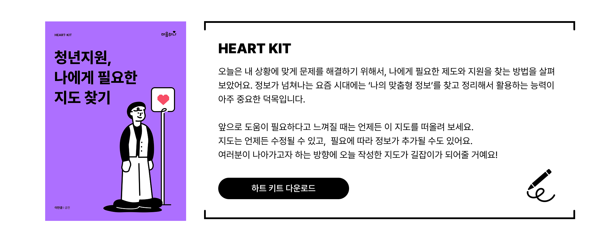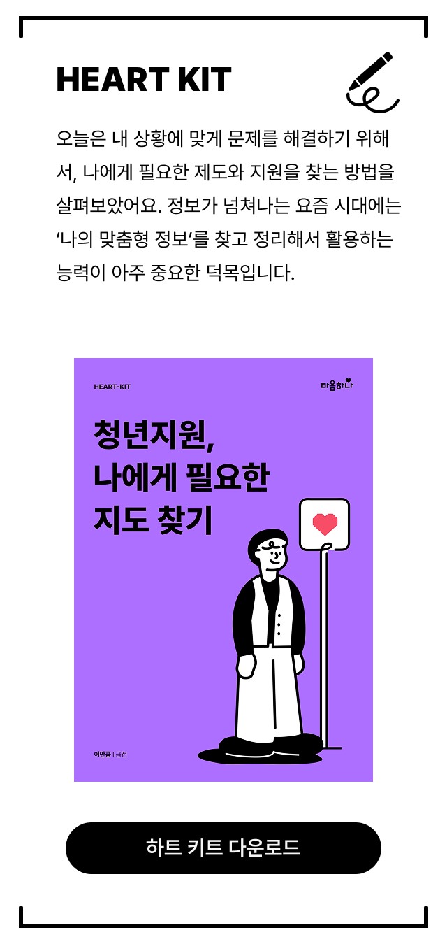마지막으로, 지금 내디딘 이 한 걸음이 더 단단해질 수 있도록 ‘하트키트(HEART-KIT)’를 준비했어요나에게 필요한 도움을 받기 위해, 꼭 다운로드 받아 실천해 보시길 바라요!